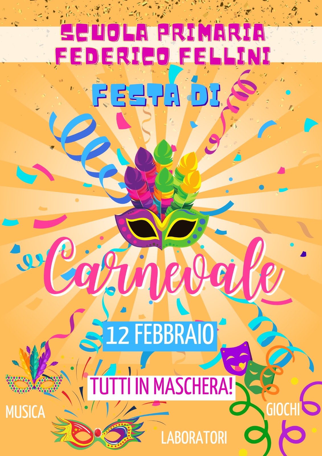 Il prossimo 12 febbraio, la nostra scuola si trasformerà in un’esplosione di colori, creatività e divertimento. Invitiamo tutti gli alunni a dare sfogo alla fantasia e presentarsi tutti in maschera per vivere insieme una giornata indimenticabile.