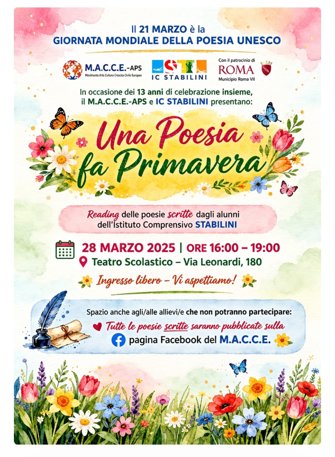 In merito al progetto educativo denominato “Una poesia fa primavera” che ha coinvolto, anche quest’anno, gli studenti dell’istituto P. Stabilini, dalla primaria alla secondaria, grazie alla collaborazione con l’associazione MACCE, si terrà la lettura delle poesie scritte dagli alunni il 28 marzo 2025 dalle ore 16:00 alle ore 19:00 presso il Teatro Scolastico – Via L. Leonardi,180.